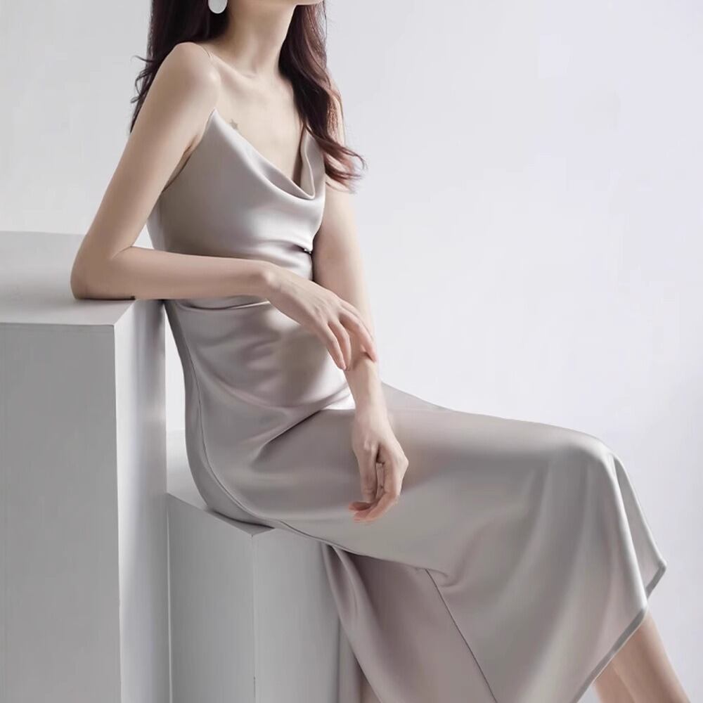 細い肩紐とスレンダーなシルエットが美しいラインを強調し、セクシーでエレガントな印象を与えます。