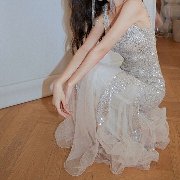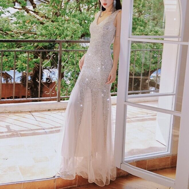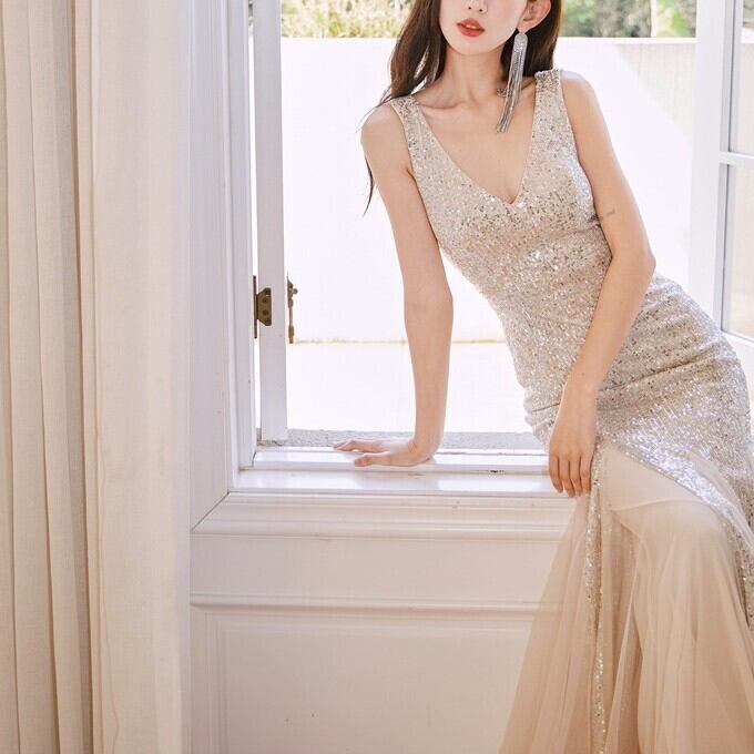 この美しいVネックデザインは、上品さとセクシーさを兼ね揃え、特別な日を彩ります。ハイウエストでAラインのシルエットは、スタイルを美しく演出し、スパンコールが輝きを添えます。結婚式やパーティー、演奏会など、あらゆるフォーマルなシーンで主役級の存在感を放ちます。