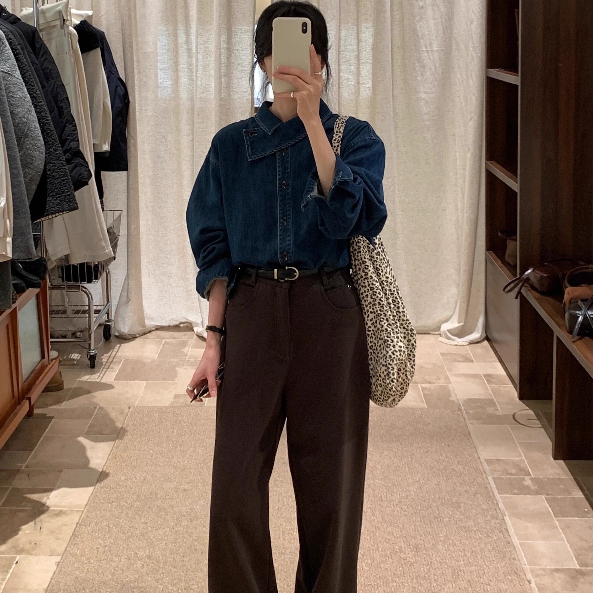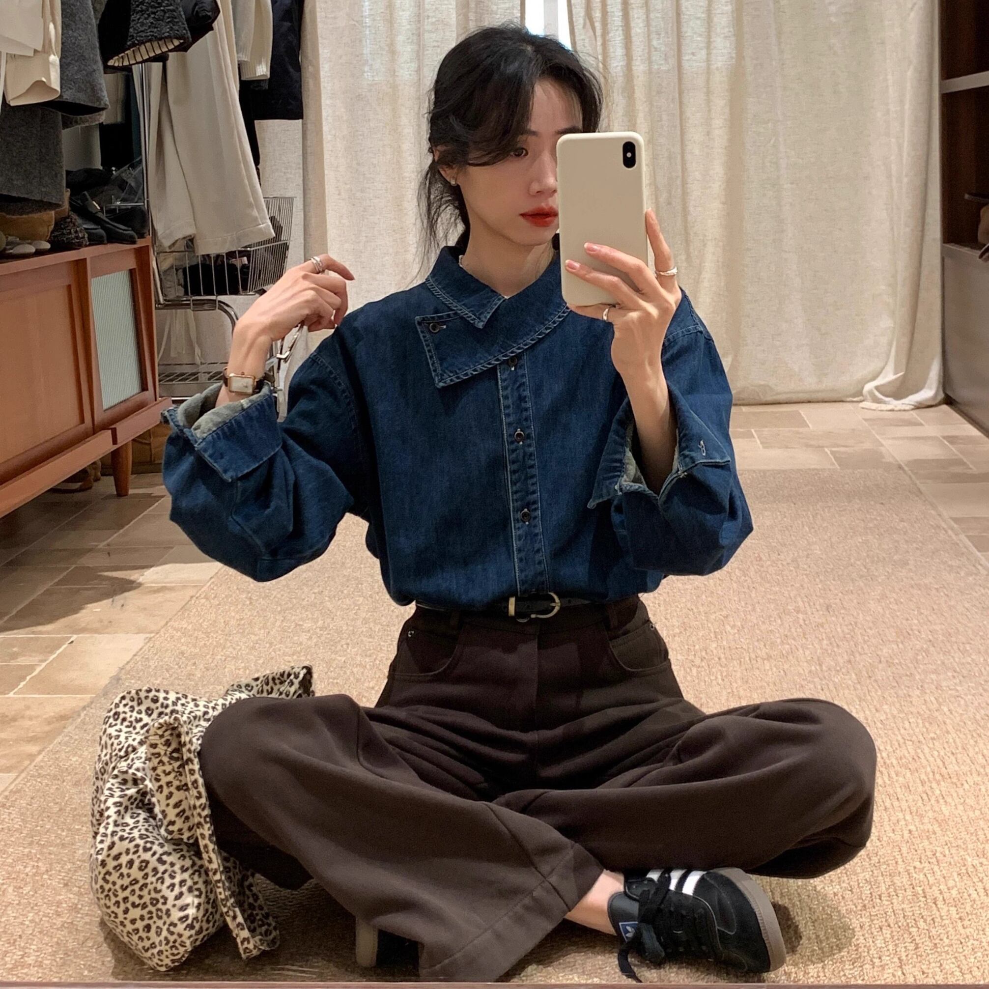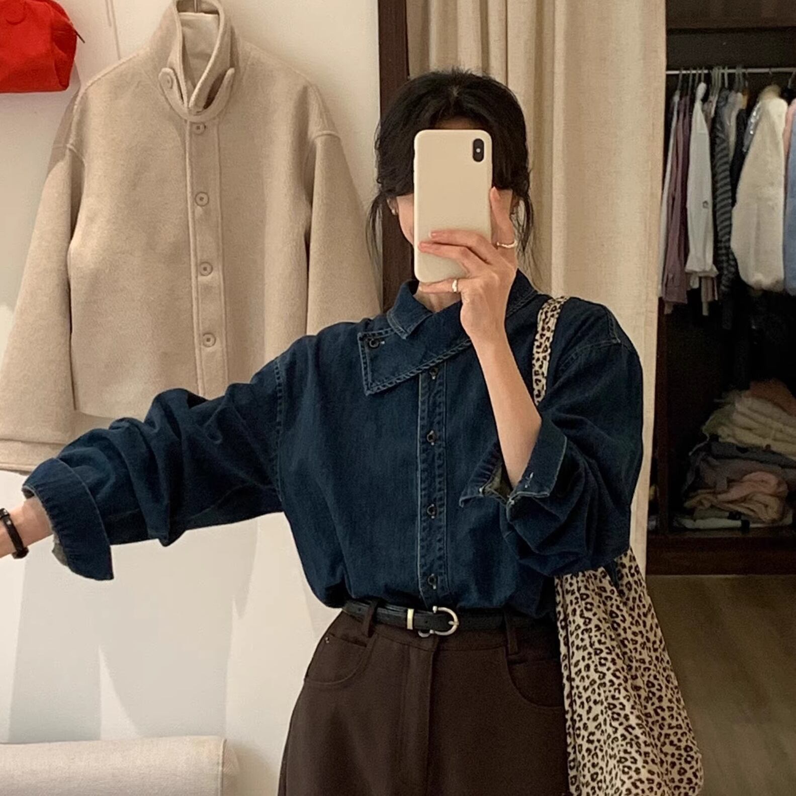 トップス シャツ デニムシャツ 長袖 襟付き アシンメトリー 前開き ボタン ミディアム丈 かわいい 大人可愛い きれいめ シンプル 上品 おしゃれ かっこいい カジュアル こなれ感 個性的 主役級 ラフ ルーズ 存在感 抜け感 秋 冬 ベーシック ナチュラル クール メンズライク 女性用 レディース ママ OL 通勤 オフィス 学生 通学 デート お出かけ お泊まり 女子会 旅行 休日 アウトドア カフェ ショッピング コンパ 普段使い デイリー 着回し 重ね着 S M L XL モテ トレンド