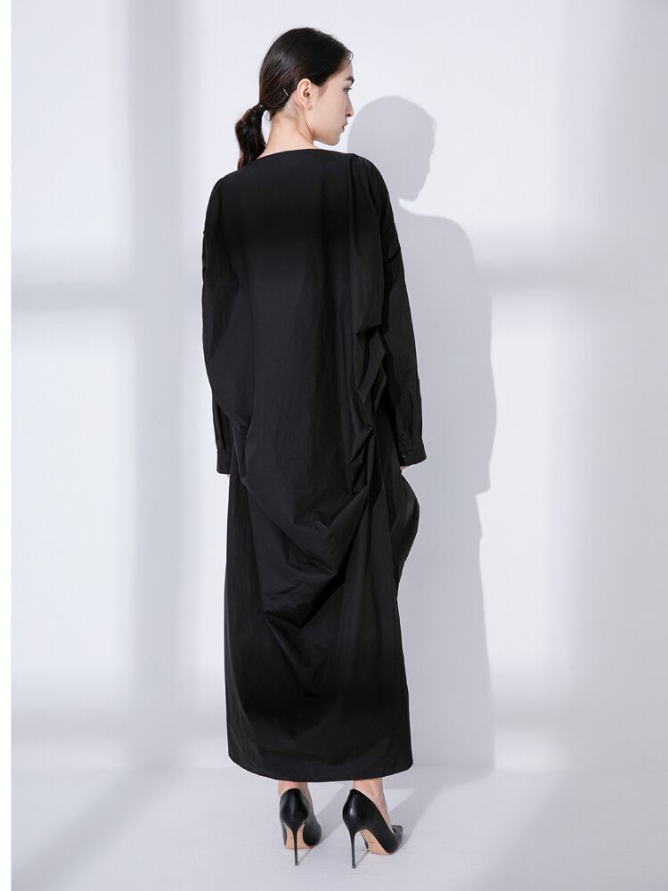 レディース スカート ワンピース ギャザースカート マキシ 長袖 ボートネック ワイド アシンメトリー オーバーサイズ ストリート タック 薄手 コットン シンプル カジュアル おしゃれ エキゾチック 個性的 存在感 無地 秋 冬 オフィス ビジネス OL 通勤 デート お出かけ パーティー イベント 旅行 女子会 休日 ショッピング M L ゆったり 黒