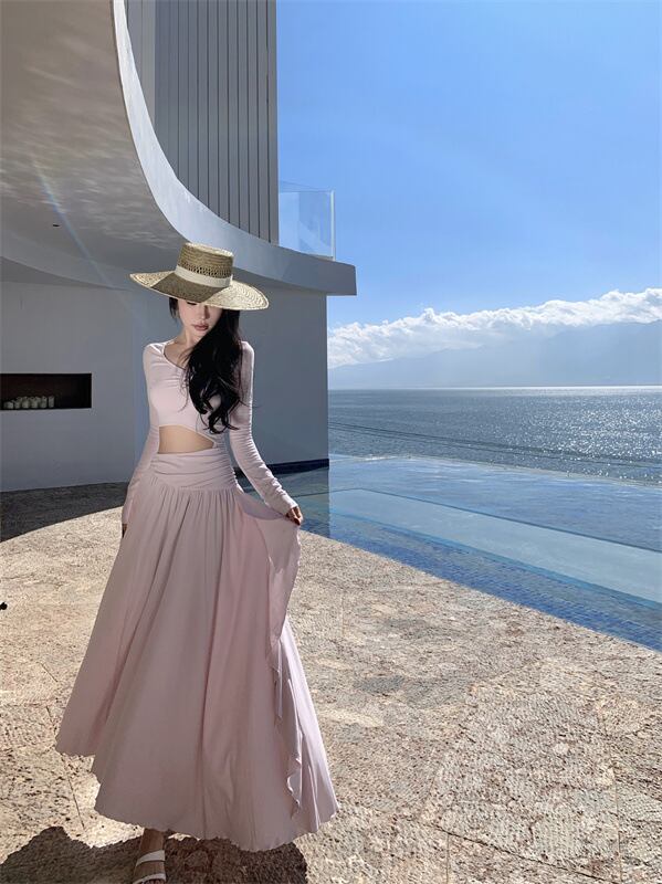 レディース ワンピース フレア ロングスカート ロング 長袖 Vネック ノーカラー フレア Aライン アシンメトリー フェミニン プリーツ ウエストマーク ハイウエスト 中厚手 伸縮性 スパンデックス かわいい シンプル カジュアル おしゃれ 個性的 存在感 無地 秋 デート お出かけ イベント リゾート ビーチ 女子会 休日 バカンス S M L グレーブルー スモーキーパープル