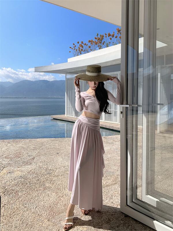 色展開は、落ち着いたグレーブルーと柔らかなスモーキーパープルの2色をご用意しています。ハイウエストデザインがスタイルを引き立て、プリーツが動きに合わせて美しく広がります。シンプルながらも個性的なアシンメトリーデザインが、存在感を際立たせます。