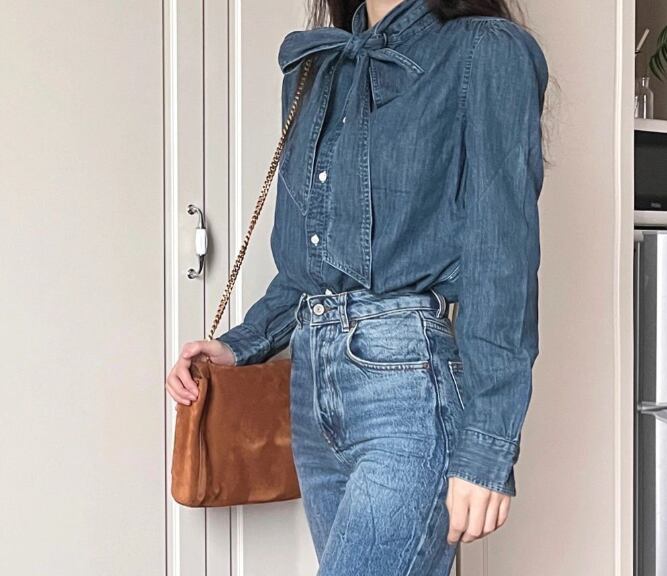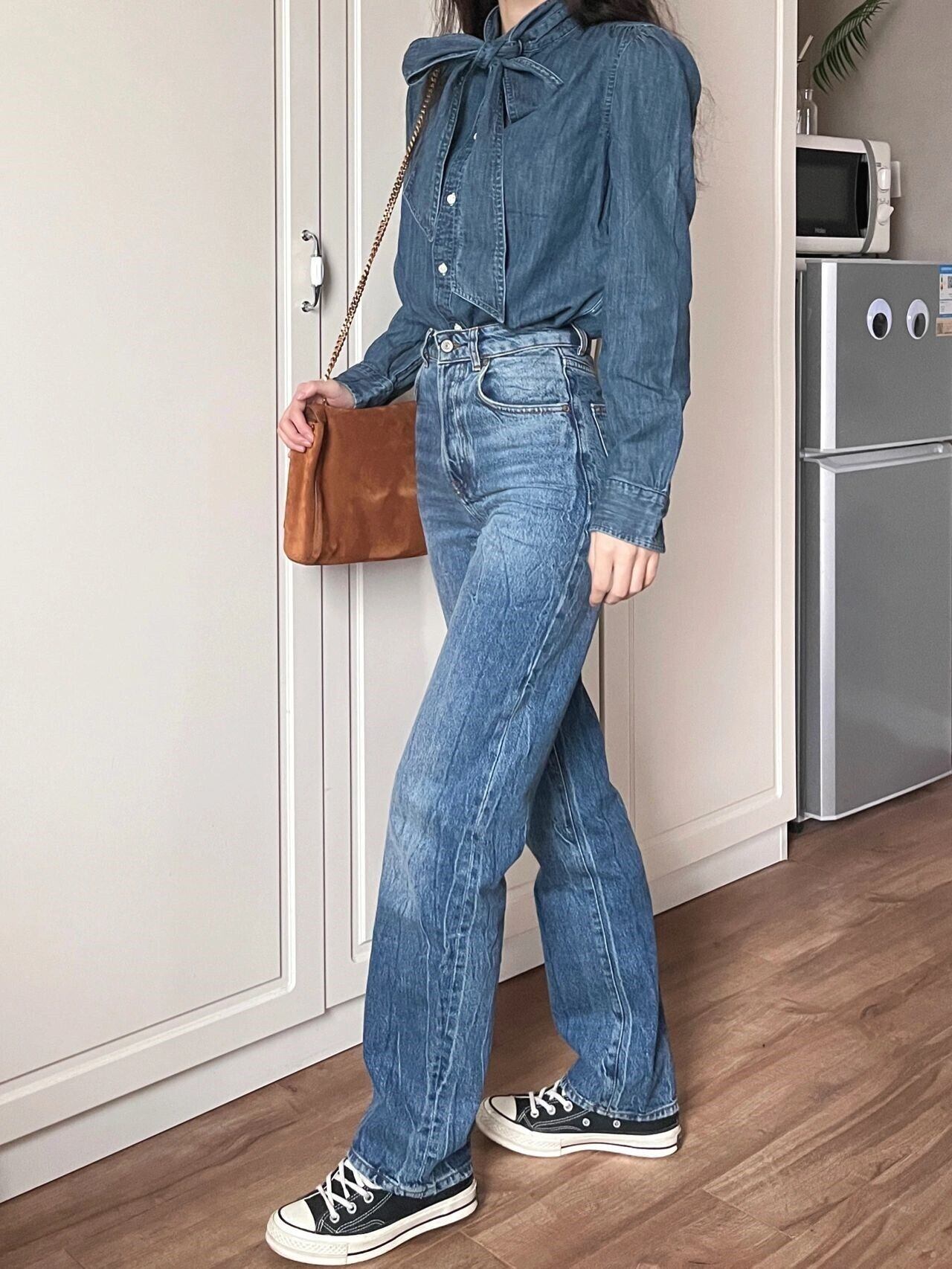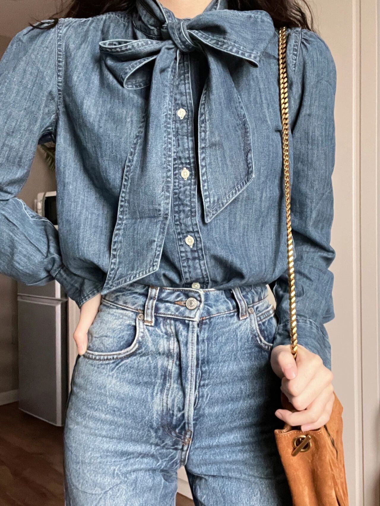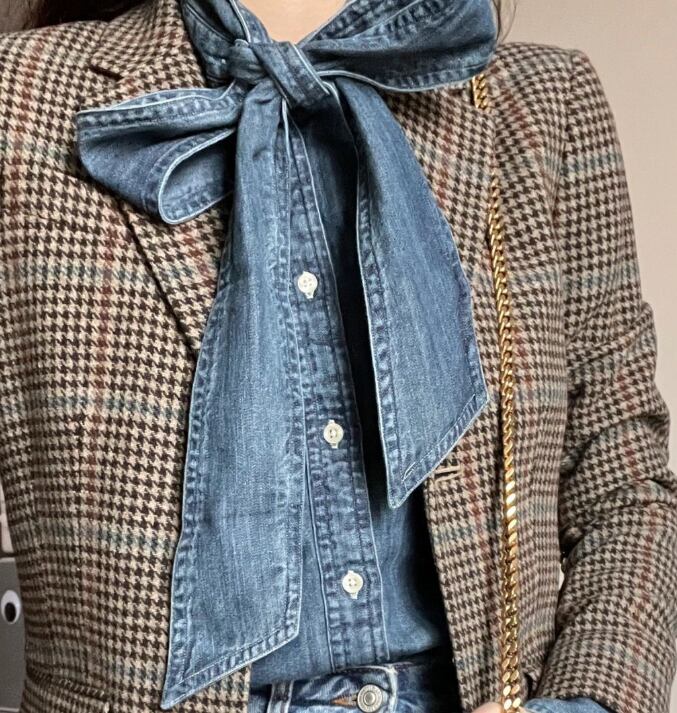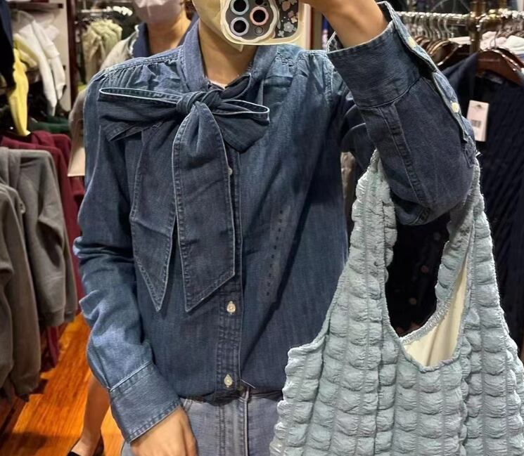 レディース トップス シャツ Yシャツ 長袖 カフスリーブ ポロカラー りぼんタイ リボン トップスラペルシャツ デニム コットン カジュアル かっこいい レトロ ボーイッシュ 個性的 無地 秋 冬 OL 通勤 学生 デート お出かけ イベント 旅行 公園 休日 ショッピング S M L デニムブルー