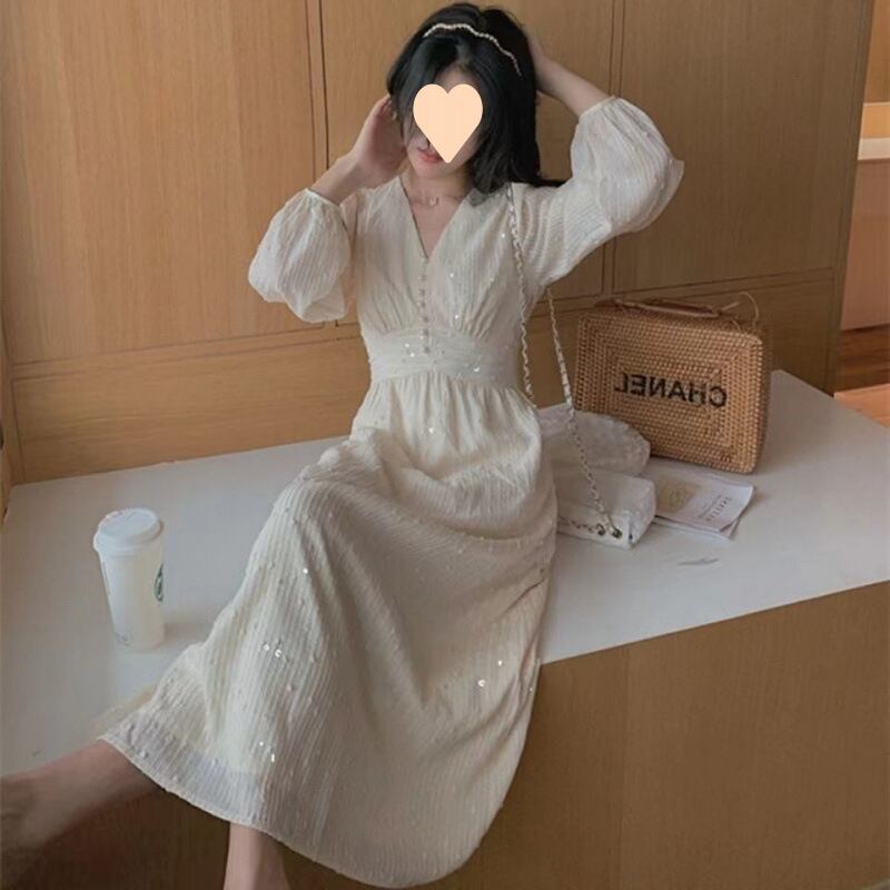 ドレス ワンピース パーティー 二次会 演奏会 発表会 ミモレ 7分袖 パフスリーブ Vネック 襟なし エンパイア Aライン プリーツ レース 刺繍 シフォン フリル ハイウエスト 透け感 シースルー 薄手 シフォン 可愛い 上品 レトロ エレガント 存在感 清楚 ナチュラル スパンコール パーティー イベント リゾート 旅行 レストラン 光沢感 春 秋 二次会 パーティー S M L XL 2XL 3XL 4XL ベージュ