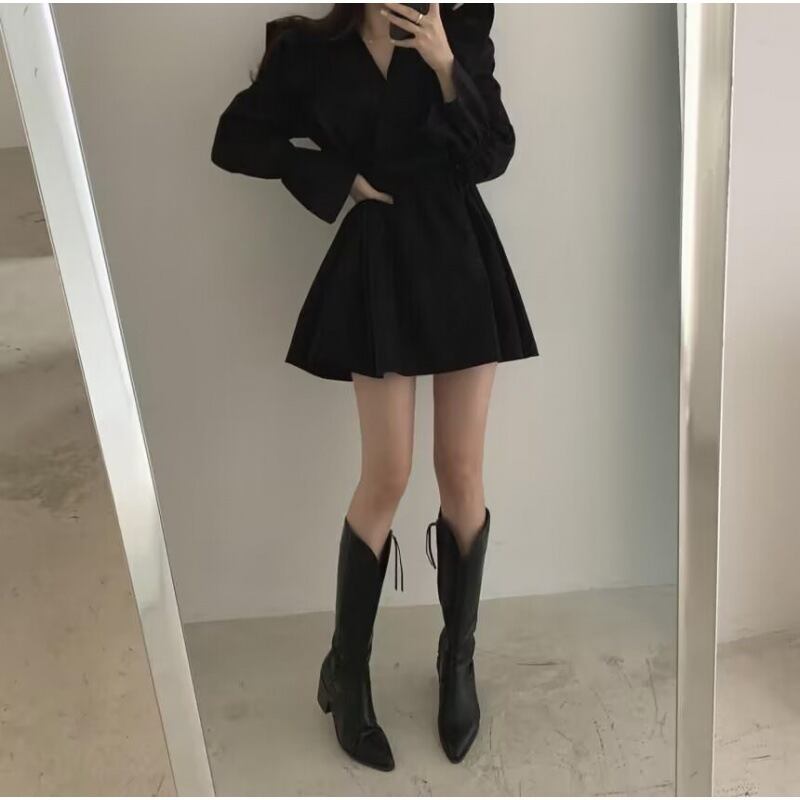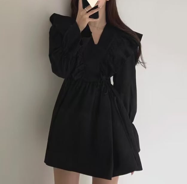 こちらの秋のファッションにぴったりな、フェミニンでレトロ感溢れるレディースワンピースが新登場です!長袖のベルスリーブとVネックの襟付きデザインが、女性らしい魅力を引き立てます。ウエストマークのリボンやクロスフリルのディテールが、存在感のあるボディラインを演出。ミニ丈のフレアAラインが脚を長く見せ、カジュアルなお出かけやイベント、休日のコーディネートに最適です。