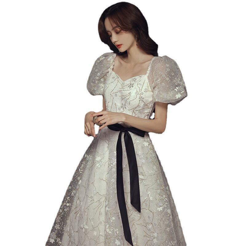 こちらは、パーティーや演奏会に最適な、エレガントなロングドレスの登場です!半袖のパフスリーブとビスチェデザインが、女性らしい魅力を一層引き立て、清楚でありながら華やかな印象を与えます。ウエストのリボンが美しいシルエットを作り出し、舞台や二次会、さらには特別なイベントにぴったりな一着です。