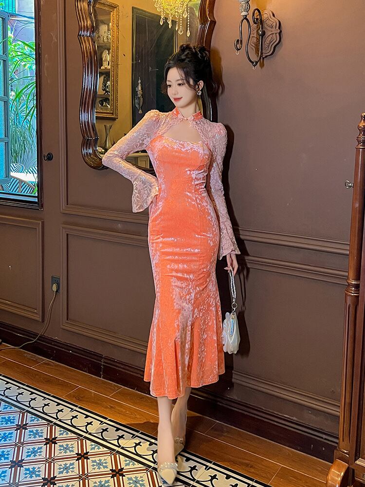 ドレス パーティー 演奏会 発表会 ステージ ロング 長袖 ドルマンスリーブ ホルターネック スレンダー タイト イブニング レース 刺繍 チュール ハイウエスト シースルー フィッシュテール フェザーヤーン ビジュー ベルベット シフォン きれいめ 上品 おしゃれ エレガント 存在感 エレガント 花柄 無地 パーティー イベント ホテル 中国風 夏 S M L XL 黒 コーラルピンク ダイヤモンドブルー
