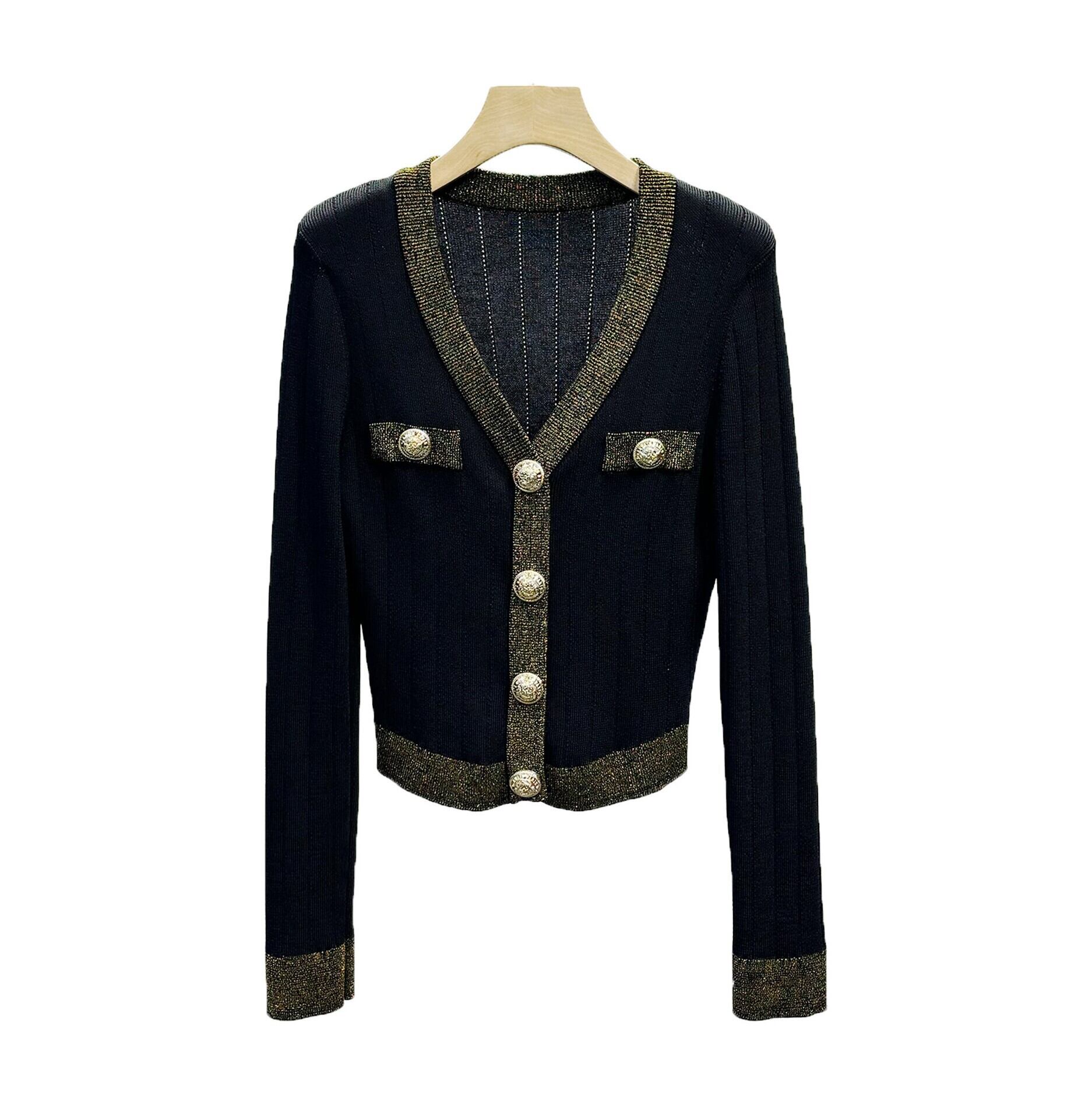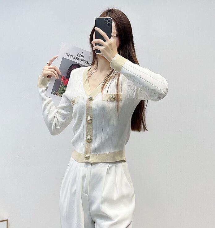 レディース トップス カーディガン ショート 長袖 レギュラースリーブ Vネック 襟なし ノーカラー スリム ストレート シングルブレスト 前開き リブニット 伸縮性 ボタン 中厚手 異素材ミックス ニット ナイロン 伸縮性 アクリル きれいめ 上品 おしゃれ レトロ 個性的 存在感 無地 ゴールドボタン 春 OL 通勤 お出かけ 公園 女子会 休日 ガーデン ショッピング カフェ S M L 白 黒 ブルー