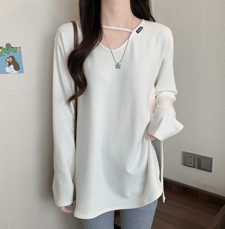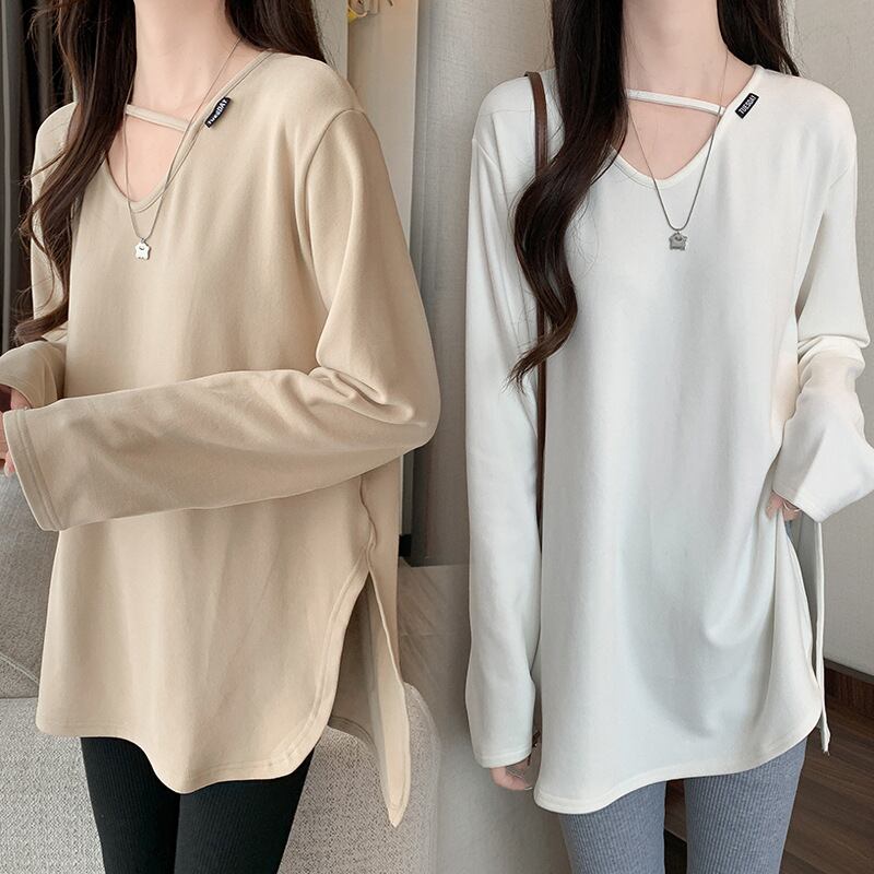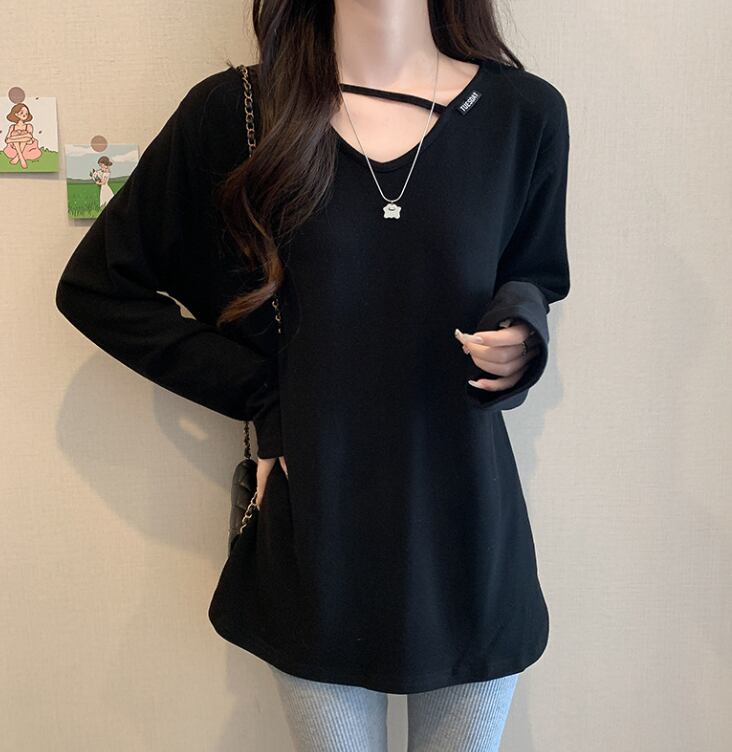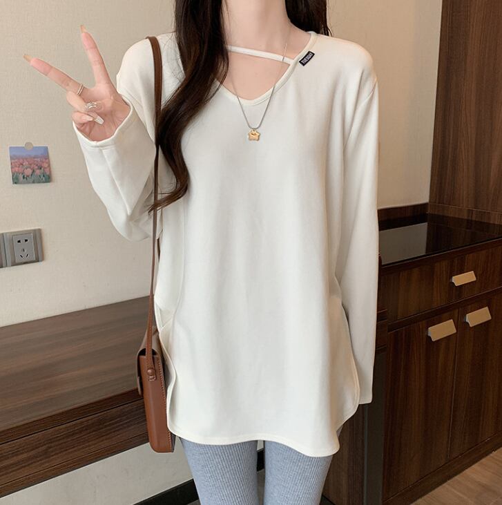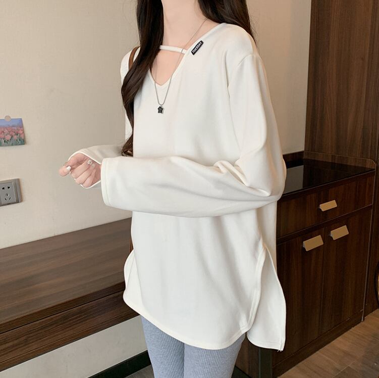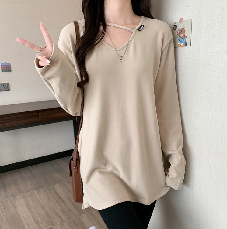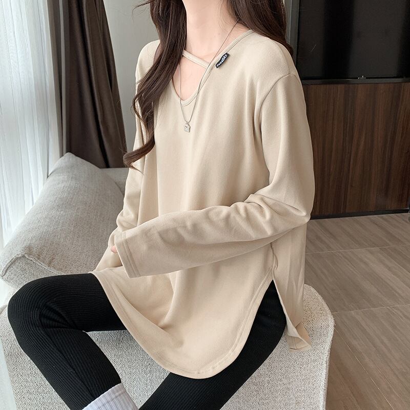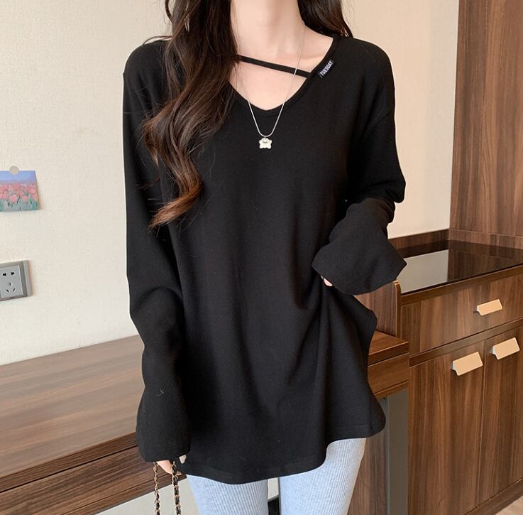 ロングクロップド丈の長袖は、快適な着心地を追求したコットンとスパンデックスのブレンド素材で、伸縮性に優れています。Vネックデザインが顔周りをすっきりと見せ、無地のシンプルなスタイルながらも、さりげないおしゃれ感を演出します。休日のショッピングやカフェでのくつろぎタイムにぴったりです!