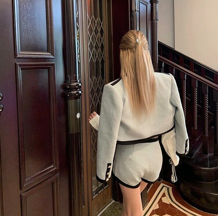 レディース ジャケット ウール ショート 長袖 レギュラースリーブ クルーネック ストレート スマート フェミニン ポケット 前開き ボタン 異素材ミックス ツイード ウール リネン かわいい 上品 おしゃれ かっこいい 個性的 エレガント 存在感 都会的 無地 秋 デート お出かけ パーティー イベント リゾート 旅行 バカンス ホテル XS S M L 水色