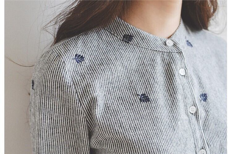 レディース トップス シャツ レギュラー丈 長袖 レギュラー袖 スタンドカラー ストレート ストリート 刺繍 前開き ボタン 薄手 綿 コットン 麻 刺繡 かわいい シンプル カジュアル おしゃれ レトロ 個性的 存在感 ストライプ リーフ 春 ロングシーズン オフィス OL 通勤 お出かけ 休日 バカンス ショッピング 普段使い 清楚 S M L XL 2XL ネイビー