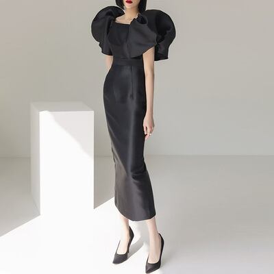 ドレス 衣装 イブニングドレス ブラックドレス 披露宴ドレス ワンピースドレス ミモレ丈ドレス ミモレ丈ワンピース 半袖 ボリューム袖 光沢 Iライン ステージドレス 発表会 かわいい 大人可愛い きれいめ シンプル 上品 おしゃれ かっこいい レトロ こなれ感 個性的 主役級 存在感 抜け感 オールシーズン シーズンレス エレガント キュート 華やか ゴージャス 無地 レディース 女性用 ママ 結婚式 披露宴 パーティー イベント 脚長 美脚 S M L XL モテ トレンド スレンダー 高見え