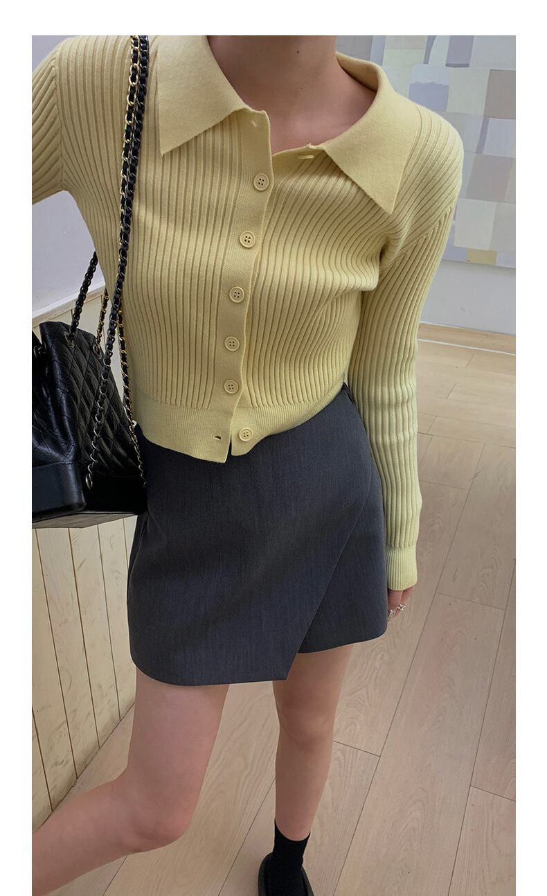 襟付き×角襟デザインが目を引く、リブニット素材のトップス。タイトなシルエットで女性らしさを引き立てつつ、ボタンを留めてトップス風にも着こなせる便利な一着です。