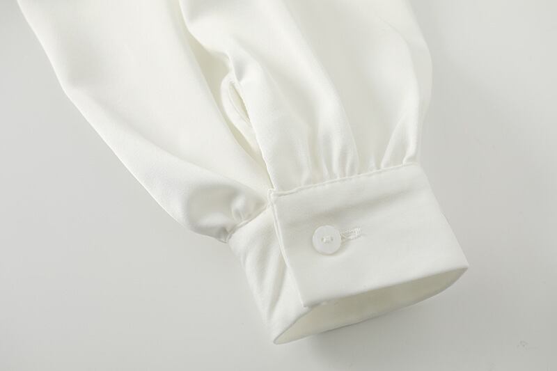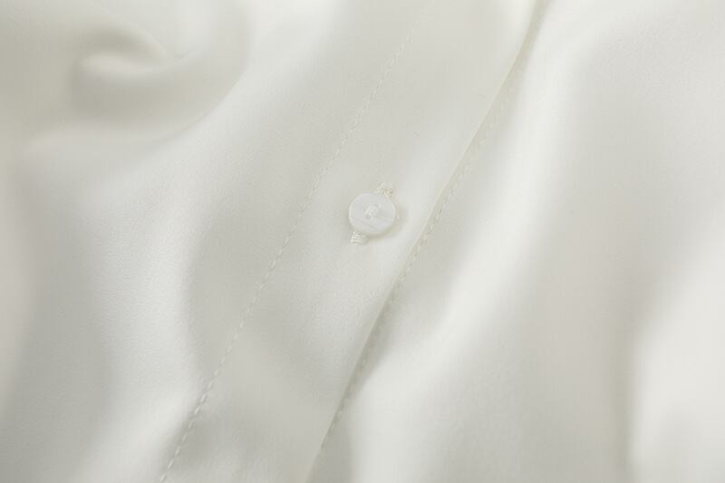 ホワイトを基調とした無地デザインで、シンプルながらも都会的なエレガンスを演出。パンツにもスカートにも合わせやすく、着回し力も抜群です。