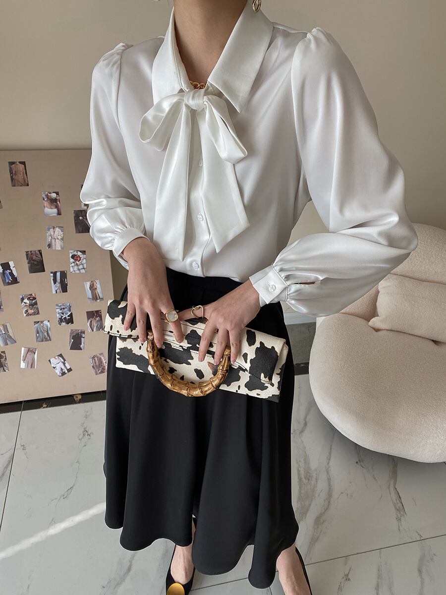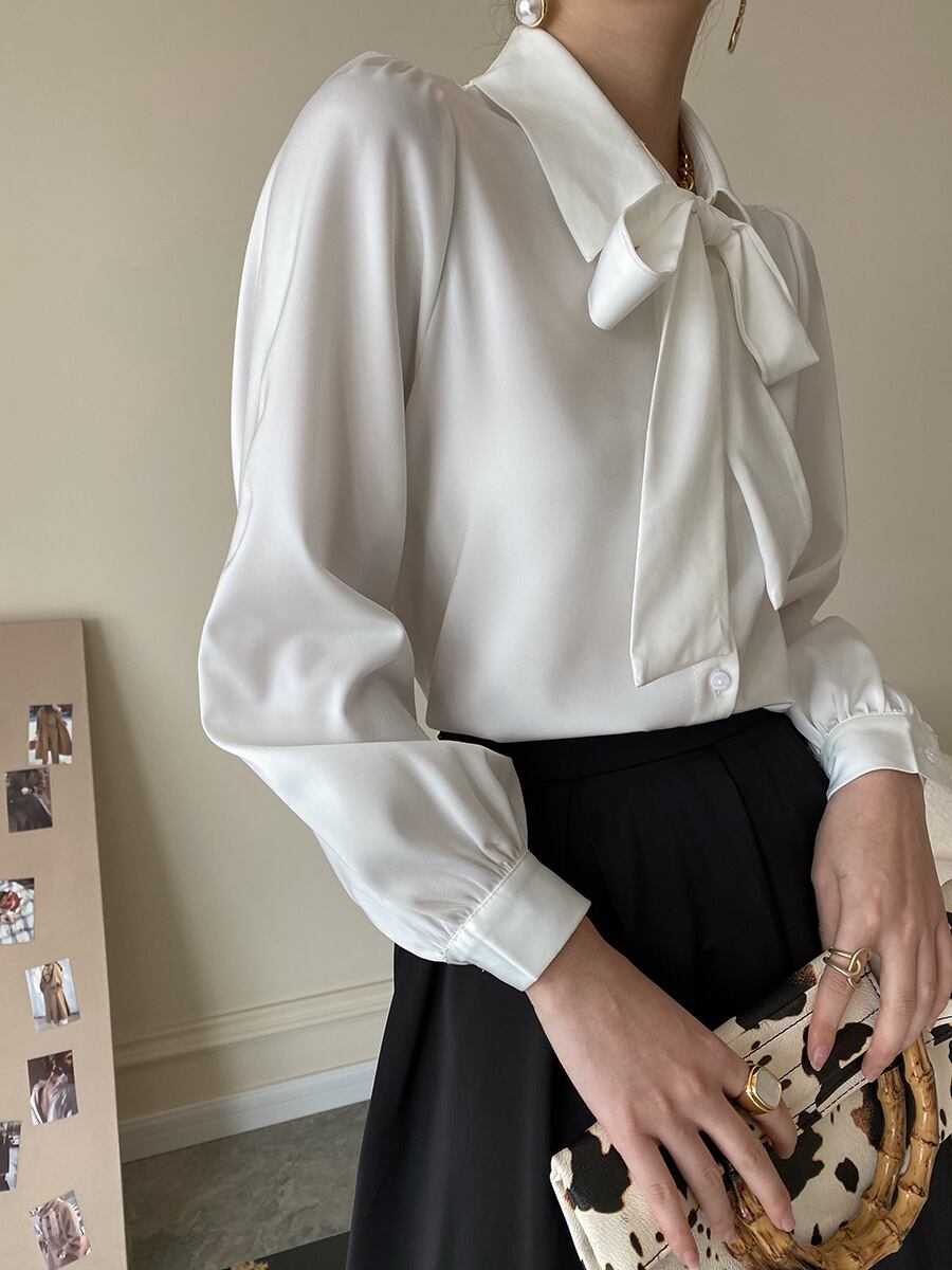 レディース トップス ブラウス 前開き 長袖 襟付き 角襟 りぼんタイ フェミニン リボン ボタン かわいい 大人可愛い きれいめ シンプル 上品 おしゃれ エレガント とろみ感 都会的 ナチュラル 無地 春 秋 冬 ロングシーズン ママ オフィス ビジネス OL 通勤 デート お出かけ パーティー イベント 旅行 レストラン 女子会 休日 ホテル ショッピング 発表会 コンサート カフェ モノトーン コーデ 普段使い 着回し 清楚 S M ホワイト ベーシックカラー