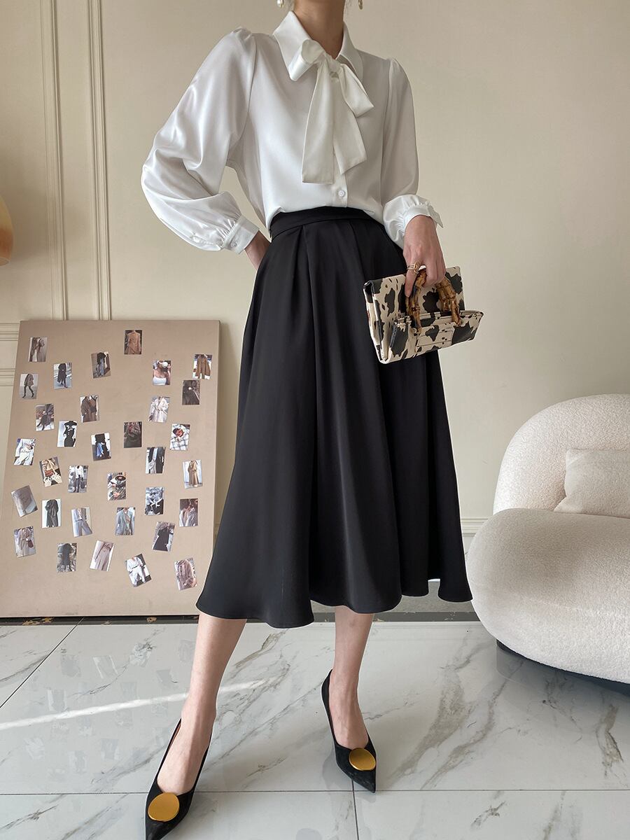 やわらかなとろみ素材に、襟付き&リボンタイが映える上品ブラウス。角襟とボタン使いがフェミニンさの中にきちんと感を添え、通勤や女子会、特別なお出かけにも活躍します。