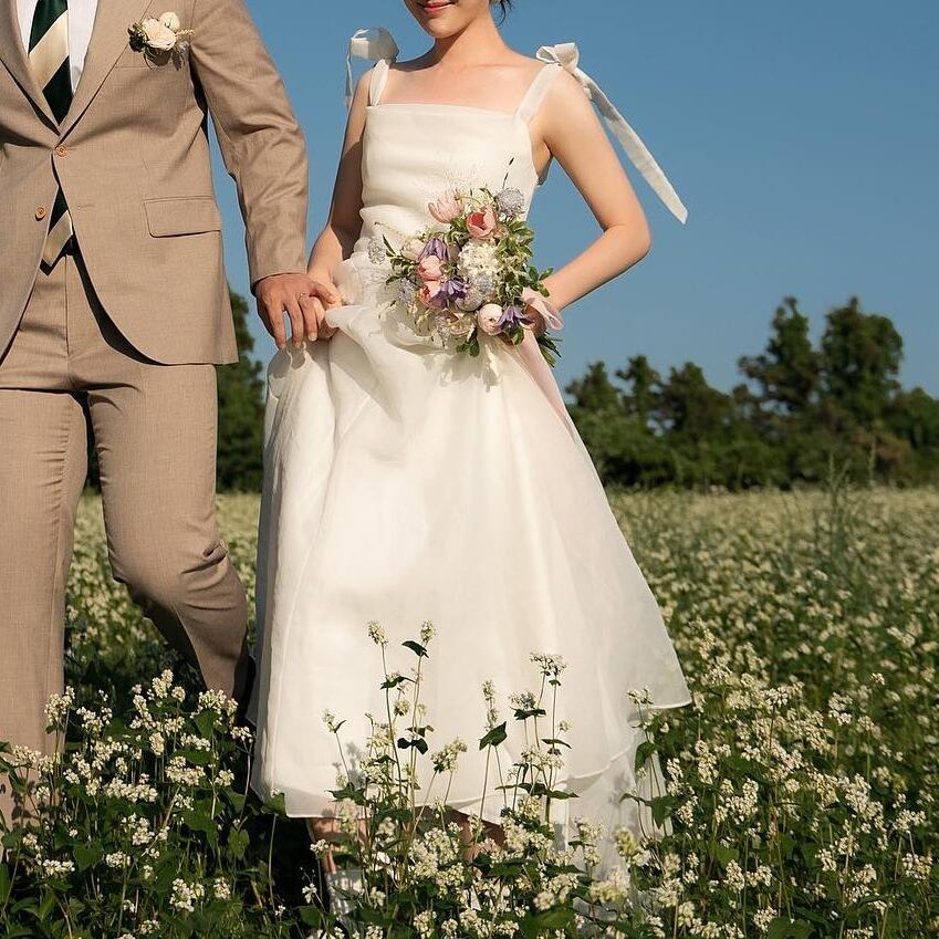 ノースリーブ・肩リボン・背中見せのエレガントなスタイルが魅力。