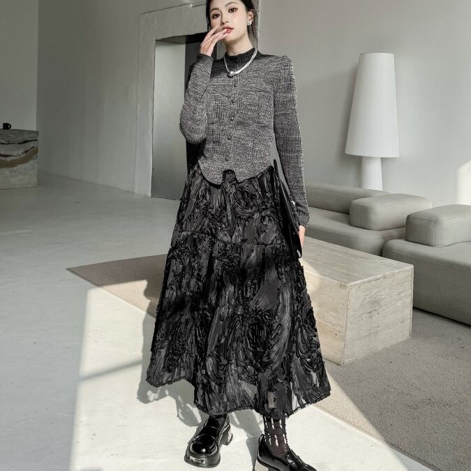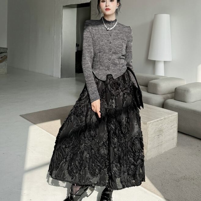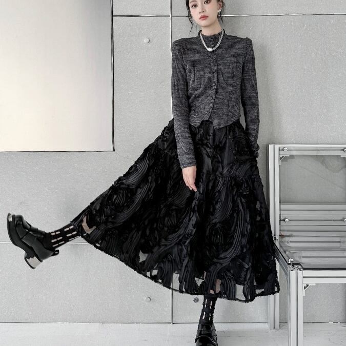スカート全体に施された刺繡がさりげないアクセントとなり、さまざまなシーンで主役級の存在感を発揮します。