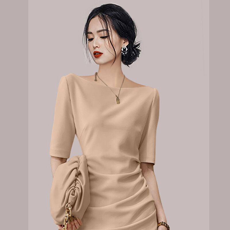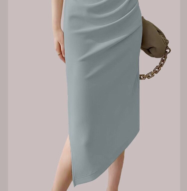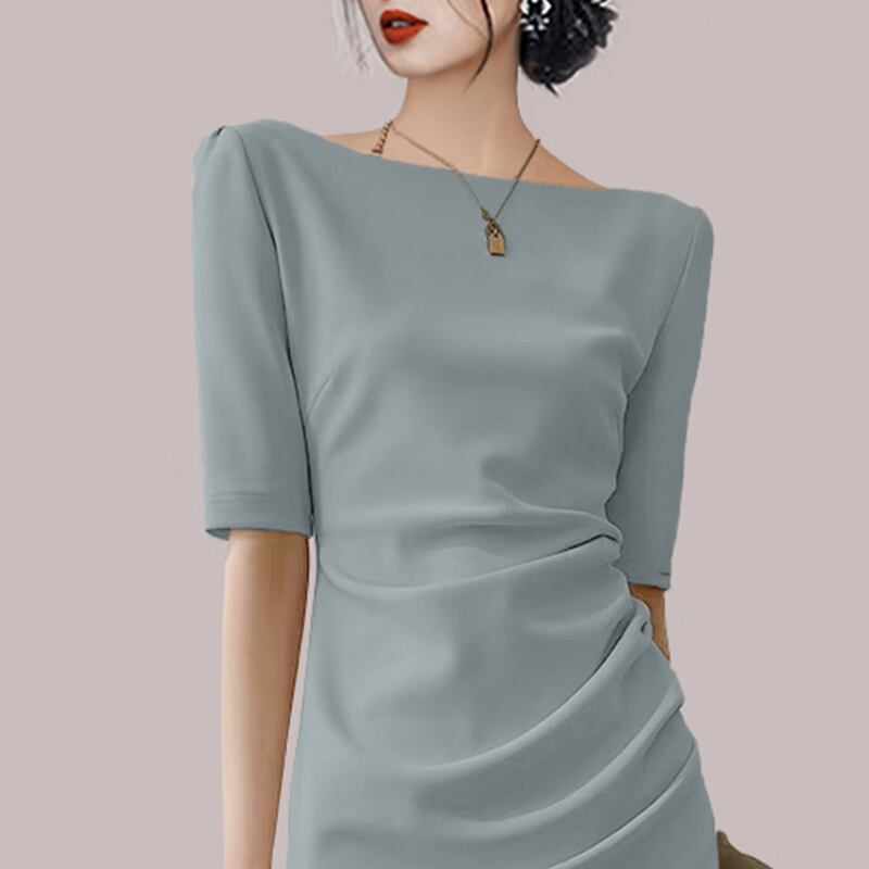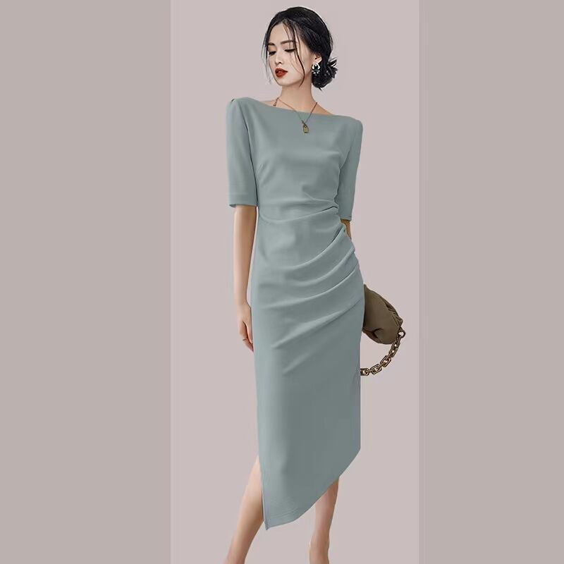 レディース ワンピース タイトスカート 膝下 長袖 レギュラースリーブ ボートネック タイト アシンメトリー スマート クイーンスタイル プリーツ ウエストマーク サイドスリット ハイウエスト ポリエステル 大人可愛い シンプル 上品 おしゃれ レトロ 個性的 存在感 無地 夏 ロングシーズン オフィス OL 通勤 お出かけ お泊まり イベント レストラン 休日 バカンス ショッピング 発表会 カフェ 脚長 普段使い 清楚 S M L XL 白 ベージュ 水色