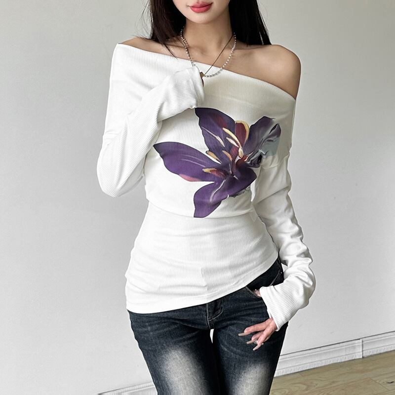 トップス カットソー 長袖 ボートネック オフショル ワンショルダー プルオーバー ミディアム丈 タイト かわいい 可愛い 大人可愛い きれいめ シンプル 上品 おしゃれ かっこいい カジュアル こなれ感 個性的 主役級 存在感 抜け感 春 秋 ベーシック ナチュラル クール 花模様 女性用 レディース OL 通勤 オフィス 学生 通学 デート お出かけ お泊まり 女子会 旅行 アウトドア 休日 カフェ ショッピング コンパ イベント 二次会 普段使い デイリー 着回し 重ね着 S M L トレンド モテ
