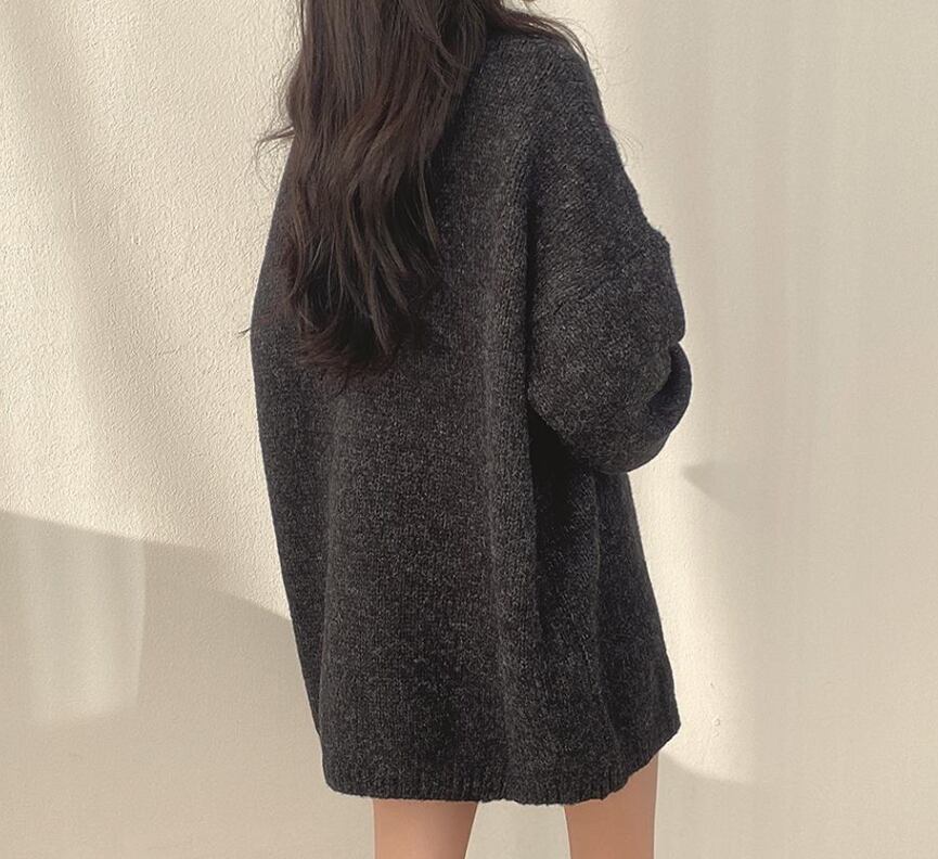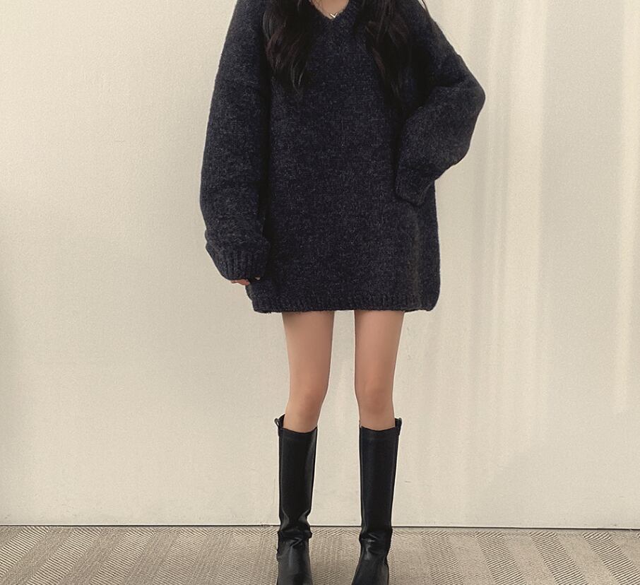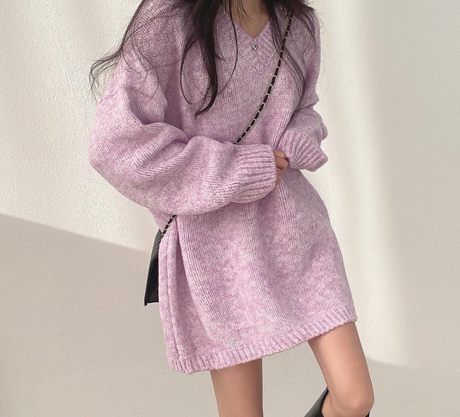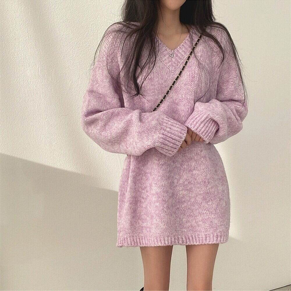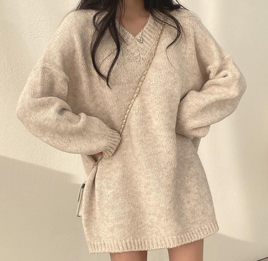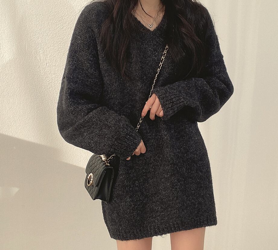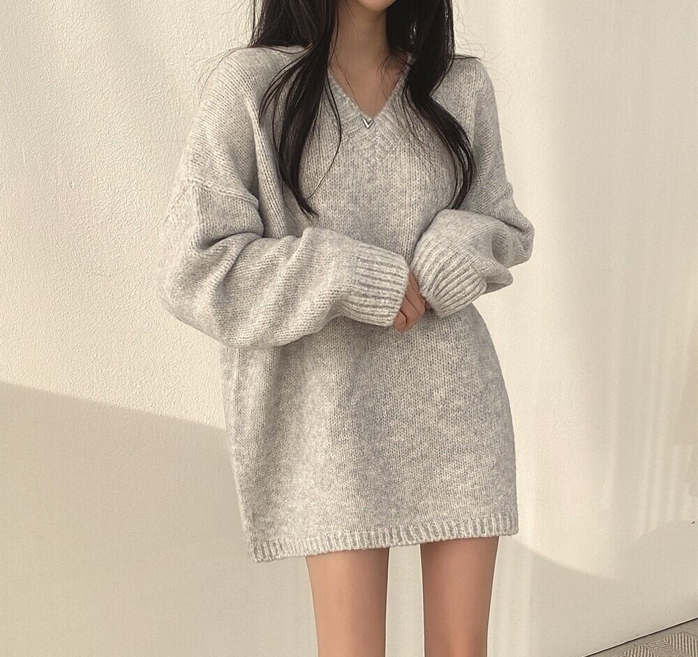 ゆったりとしたドロップショルダーとVネックが女性らしさを引き立てる、フェミニンなニットトップスです。膝上丈の程よい長さで、体型カバーをしながらもすっきりとした印象を与えます。
