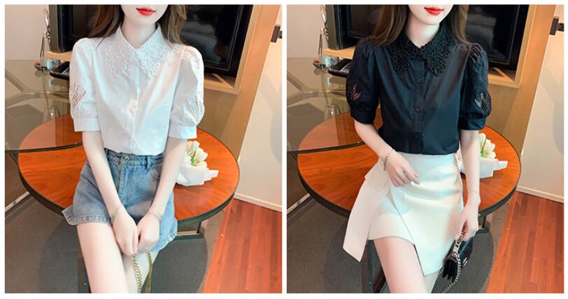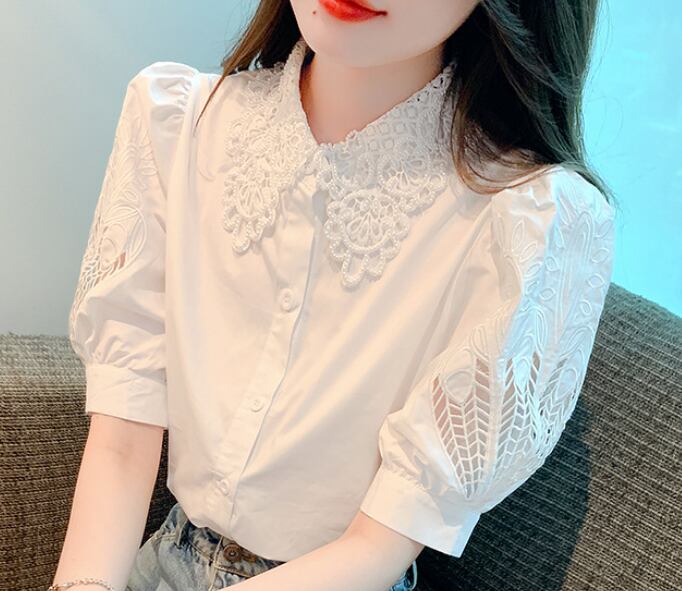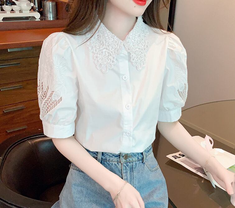 レディース トップス ブラウス レギュラー丈 半袖 パフスリーブ ポロカラー スリム ストレート レース 刺繍 フリル 前開き 透け感 中厚手 刺繡 かわいい きれいめ 上品 おしゃれ ガーリー 個性的 存在感 無地 花柄 夏 通勤 デート お出かけ パーティー イベント リゾート 旅行 レストラン ビーチ 公園 女子会 休日 バカンス 高原 ホテル ガーデン ショッピング 発表会 コンパ カフェ 普段使い モテ 清楚 S M L XL 2XL ゆったり 白 黒