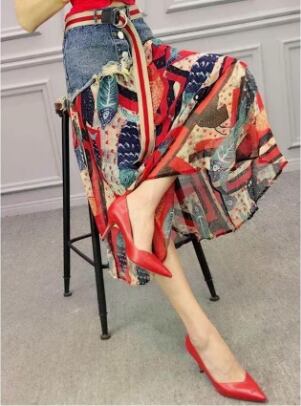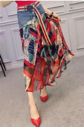 《存在感抜群のデニムパッチワークシフォンスカート》