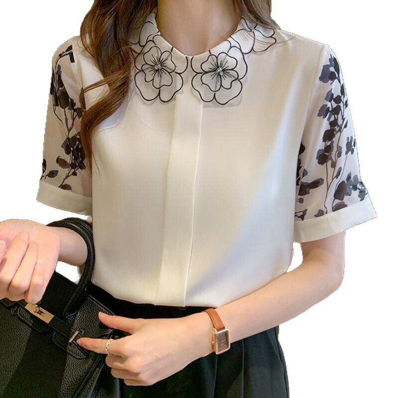 レディース トップス ブラウス カットソー レギュラー丈 半袖 レギュラースリーブ 丸襟 花柄襟 ストレート フェミニン タック レース 刺繍 シフォン 刺繡 ポリエステル繊維 大人可愛い シンプル 上品 おしゃれ 個性的 エレガント 存在感 無地 花柄 夏 通勤 お出かけ イベント リゾート 旅行 休日 バカンス ショッピング 普段使い 清楚 S M L XL 2XL ホワイト