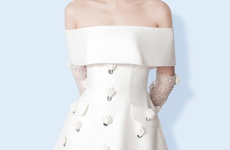 立体的なフラワーモチーフや切り替えデザインがさりげないアクセントとなり、無地ながら存在感のある一着に。清楚さと大人の可愛らしさを併せ持つデザインは、花嫁さんの二次会用ドレスとしてやホテルディナー、バカンスのシーンにもぴったりです。
