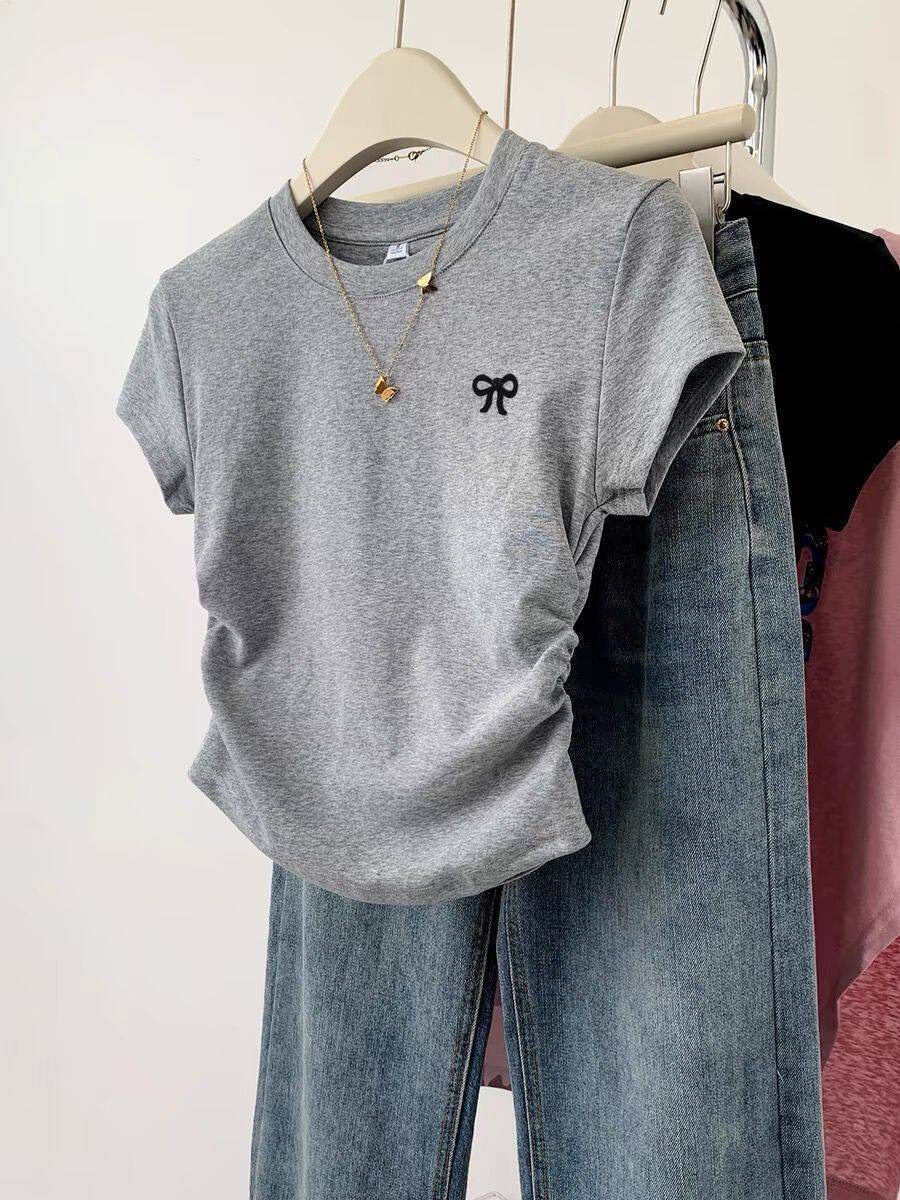 レディース トップス Tシャツ ショート 半袖 レギュラースリーブ クルーネック スリム フェミニン リボン ギャザー 薄手 コットン スパンデックス かわいい シンプル カジュアル おしゃれ ラフ ナチュラル 無地 リボンマーク 夏 お出かけ アウトドア キャンプ イベント リゾート 旅行 海 プール ビーチ ジム 公園 女子会 休日 バカンス ショッピング カフェ 普段使い S M L XL グレー