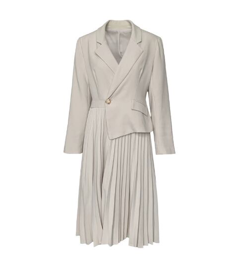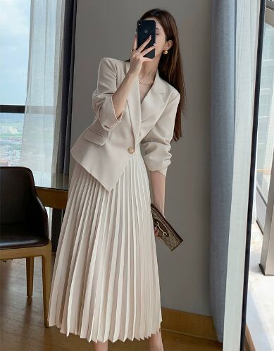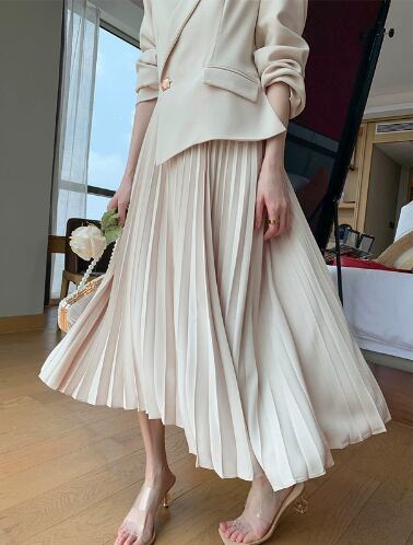 レディース スカート ワンピース スーツ ロングスカート ツーピーストップス 膝丈 膝下 長袖 襟付き 角襟 セミフレア プリーツ ボタン 切り替えデザイン 中厚手 ポリエステル 大人可愛い きれいめ シンプル 上品 おしゃれ かっこいい エレガント フォーマル かっちり ナチュラル 無地 秋 入学式 入園式 授業参観 ママ オフィス ビジネス OL コンサート 美脚 定番 S M L XL アプリコット