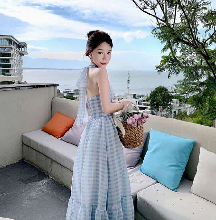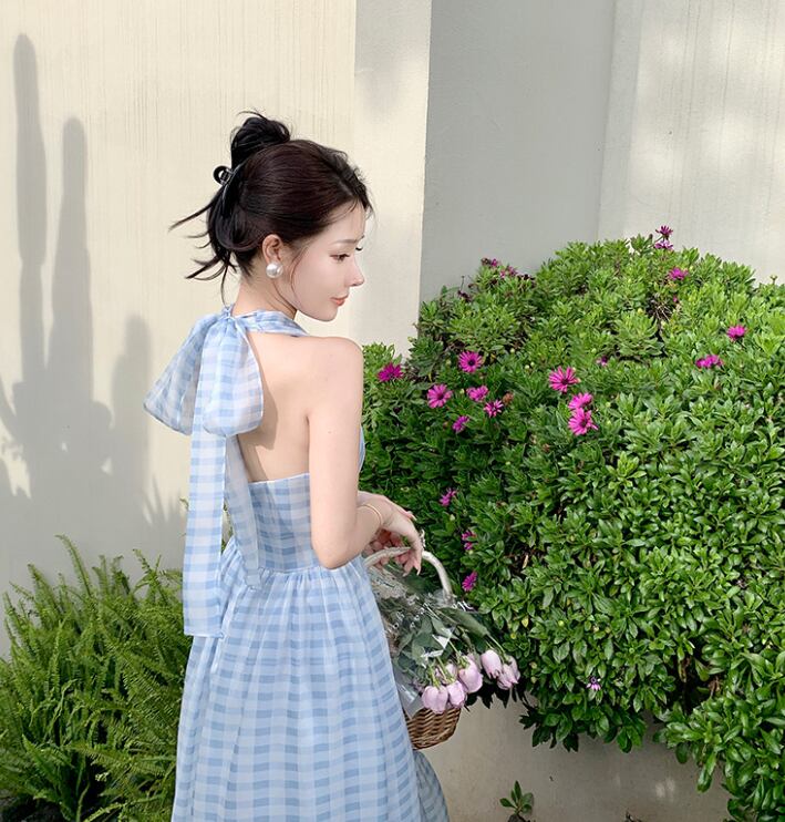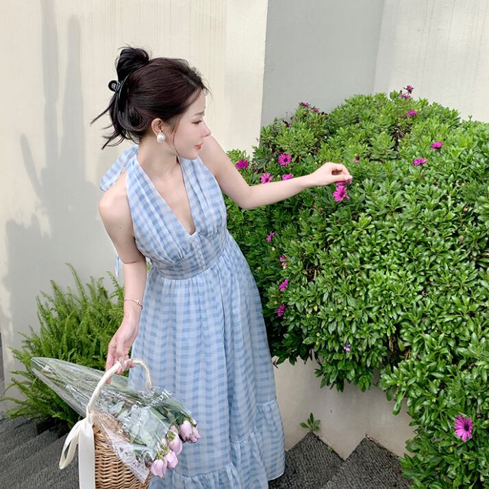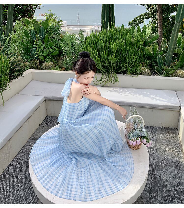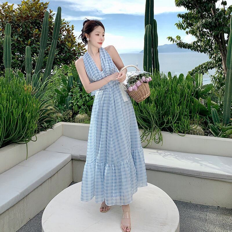 レディース ワンピース ロングスカート ロング ノースリーブ ホルターネック ワイド フレア Aライン 背中開き ティアード フェミニン プリーツ シフォン ハイウエスト 薄手 ポリエステル かわいい カジュアル おしゃれ レトロ ラフ ガーリー 個性的 チェック 夏 デート お出かけ リゾート 旅行 海 プール ビーチ 女子会 休日 バカンス ガーデン ショッピング S M L 水色