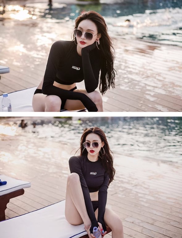水着 ビキニ タンキニ 体型カバーのご案内です!このビキニセットは、シンプルでありながら存在感のあるデザインが特徴です。長袖のラッシュガードがついているため、夏の海やプール、温泉などでの体型カバーにも最適。リボンのアクセントが大人っぽく、個性的な印象を与えます。シンプルながらかっこいいスタイルは、リゾートや旅行はもちろん、おしゃれな海辺のカジュアルシーンにもぴったりです。