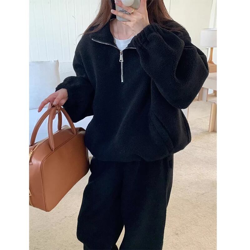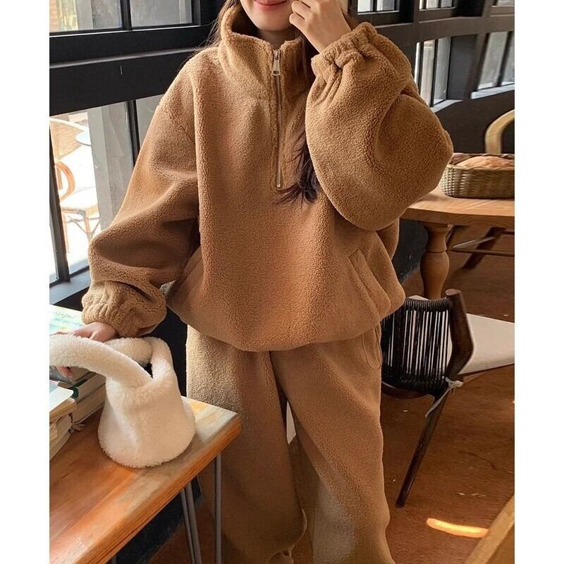 レディース トップス パンツ ボトムス プルオーバー セットアップ ジョガーパンツ 長袖 ドロップショルダー 襟付き スタンドカラー ストリート もこもこ ファスナー ポケット ボア かわいい シンプル カジュアル おしゃれ かっこいい こなれ感 ラフ メンズライク スポーティー ナチュラル 無地 秋 冬 ママ 学生 学校 通学 お出かけ アウトドア キャンプ 旅行 ジム 公園 休日 コーデ 楽ちん 暖かい 普段使い 着回し S M L ゆったり ゆる ブラック キャメル 大人カラー ベーシックカラー