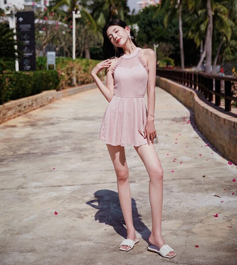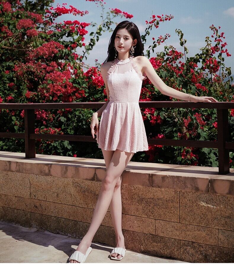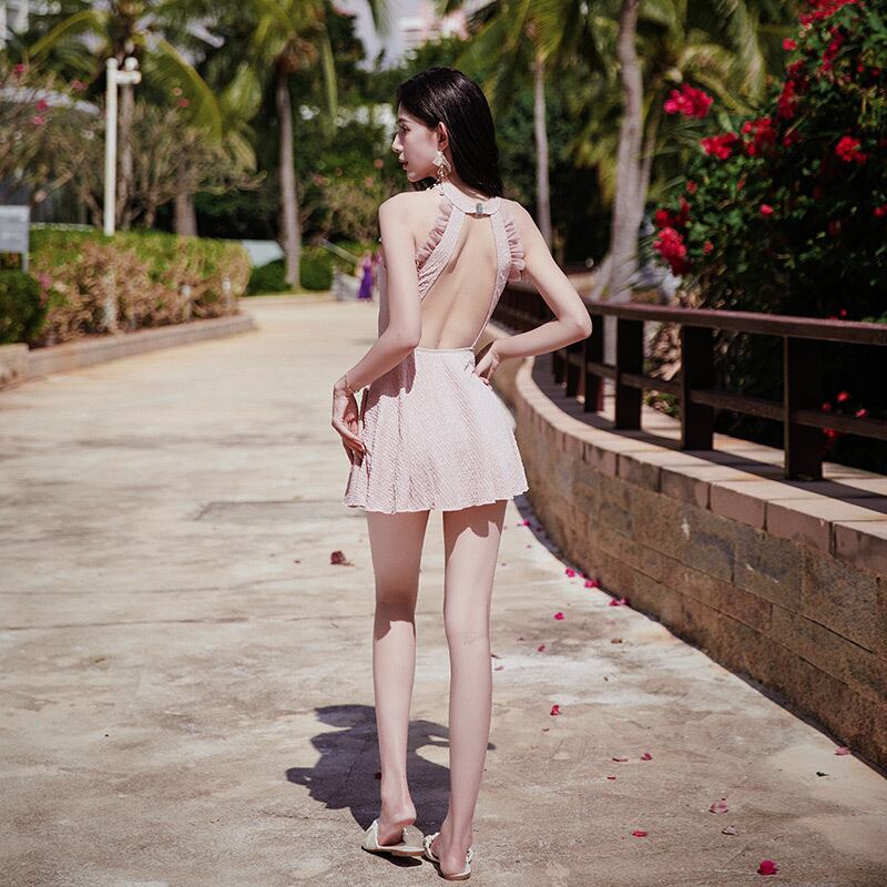 水着 ビキニ ワンピース ホルターネック チュール ハイウエスト メッシュ かわいい 華やか 大人っぽい おしゃれ 存在感 個性的 フェミニン 無地 リゾート 旅行 温泉 プール 夏 海 美脚 背中見せ M L XL 2XL ピンク