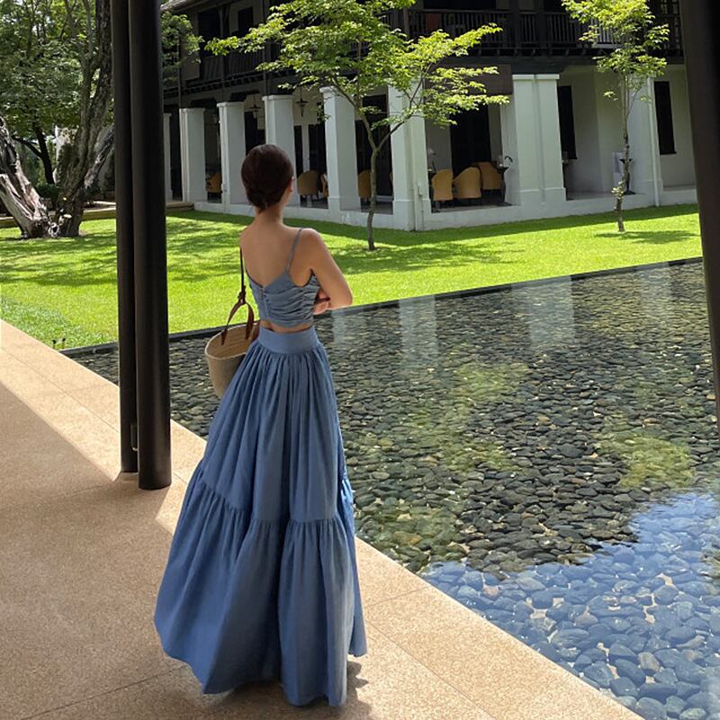 レディース スカート トップス ロングスカート ツーピーストップス ロング 袖なし キャミソール スクエアネック ワイド タイト スリム オーバーサイズ 裾ワイド セパレート フェミニン プリーツ タックプリーツ ギャザー ティアード コットン ポリエステル かわいい カジュアル 上品 おしゃれ ラフ 個性的 存在感 無地 夏 デート お出かけ イベント リゾート 旅行 海 プール レストラン ビーチ 女子会 休日 バカンス 普段使い フリーサイズ 水色