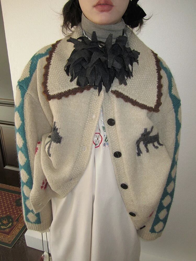 こちらのニットカーディガンは、長袖と襟付きのビッグカラーが魅力的なデザインです。