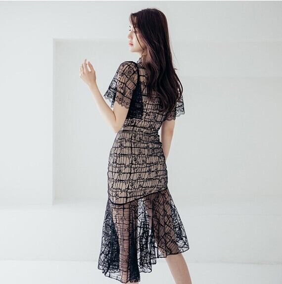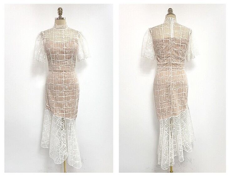 レディース ワンピース レーススカート 膝上 半袖 フレアスリーブ フリル袖 襟付き アシンメトリー タイト アシンメトリー フェミニン プリーツ レース 刺繍 ファスナー 透け感 シースルー ティアード 薄手 ポリエステル 大人可愛い 上品 おしゃれ 個性的 エレガント 存在感 花柄 夏 二次会 お出かけ パーティー イベント リゾート 旅行 ホテル 発表会 清楚 S M L XL 白 黒
