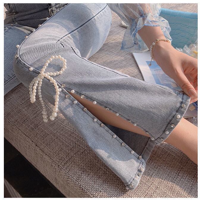レディース パンツ デニムパンツ ロング ワイド スリム 裾ワイド ブーツカット ストリート スリット ファスナー ポケット ハイウエスト レースアップ ダメージ ビジュー デニム コットン かわいい カジュアル おしゃれ 個性的 存在感 キュート 無地 オールシーズン ロングシーズン デート お出かけ 旅行 女子会 休日 バカンス ショッピング カフェ 美脚 モテ S M L XL ブルー