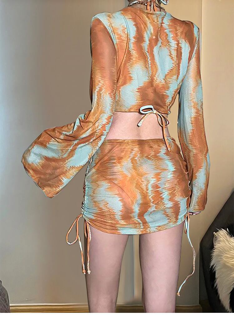 水着 ビキニ レディース ラッシュガード セパレート ホルターネック ドロスト スプリット セット きれいめ カジュアル 華やか 大人っぽい おしゃれ 存在感 個性的 タイダイ柄 リゾート 旅行 温泉 プール 夏 海 美脚 日除け M L XL