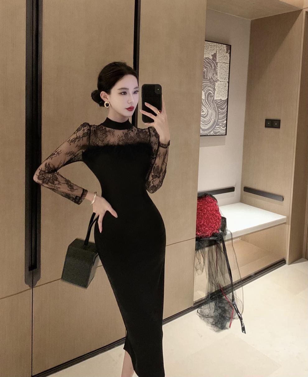 ドレス ワンピース 結婚式 二次会 披露宴 演奏会 発表会 ステージ ロング 長袖 ハーフネック スレンダー タイト ペンシルスカート レース 刺繍 スリット 切り替えデザイン ハイウエスト 透け感 シースルー ファー シアー 薄手 きれいめ 上品 おしゃれ エレガント 存在感 セクシー 無地 パーティー イベント リゾート 旅行 ホテル ガーデン 春 シーズンレス S M L 黒