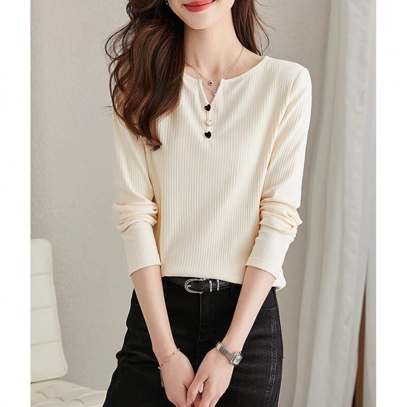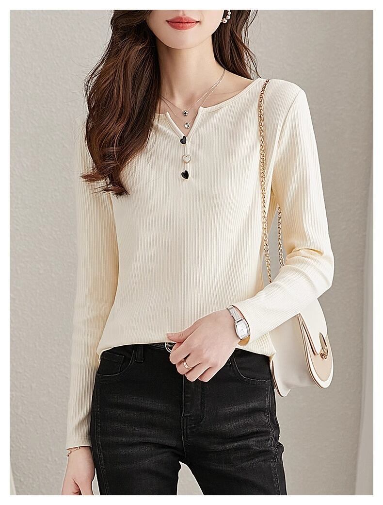 このレディースの長袖Tシャツは、秋からロングシーズンにわたって活躍するカジュアルでフェミニンなデザインが魅力です。Vネックとタイトなシルエット、そしてリブニット素材が美しいラインを生み出し、あなたの魅力を引き立てます。ハートボタンのアクセントがあり、シンプルながらもおしゃれな印象を与えます。