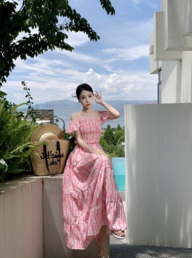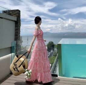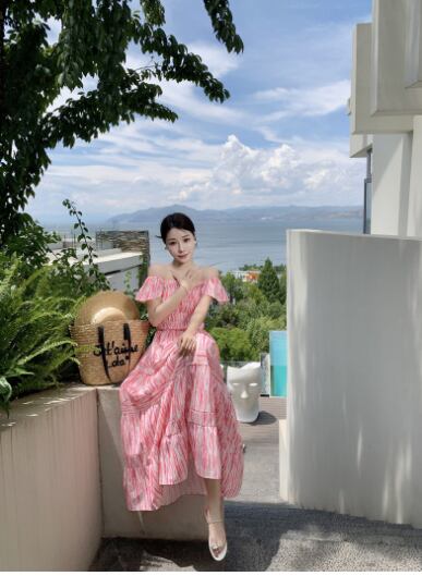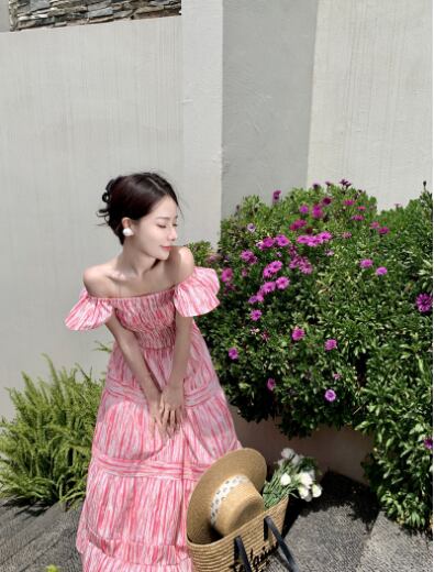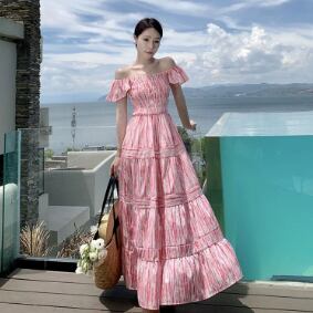 レディース スカート ドレス ロングスカート ロング ノースリーブ フライングスリーブ ワンショルダー フレア 切り替え フェミニン ウエストマーク ふわふわ ふっくら ハイウエスト 薄手 ポリエステル かわいい おしゃれ ガーリー ラブリー 学生風 花柄 夏 発表会 デート お出かけ パーティー 海 ビーチ 休日 バカンス 高原 ショッピング 発表会 コンサート ライブ 脚長 M L XL ピンク
