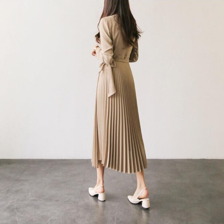 存在感抜群のレディースワンピーススーツが登場です!ロング丈の長袖とVネックの襟付きデザインが、上品かつエレガントな印象を与え、大人可愛いスタイルを演出します。プリーツが施されたこのアイテムは、通勤やデート、お出かけはもちろん、パーティーや女子会、ホテルでのディナーにもぴったりです。普段使いから特別なシーンまで幅広くコーディネートでき、インスタ映えすること間違いなしの一着です!