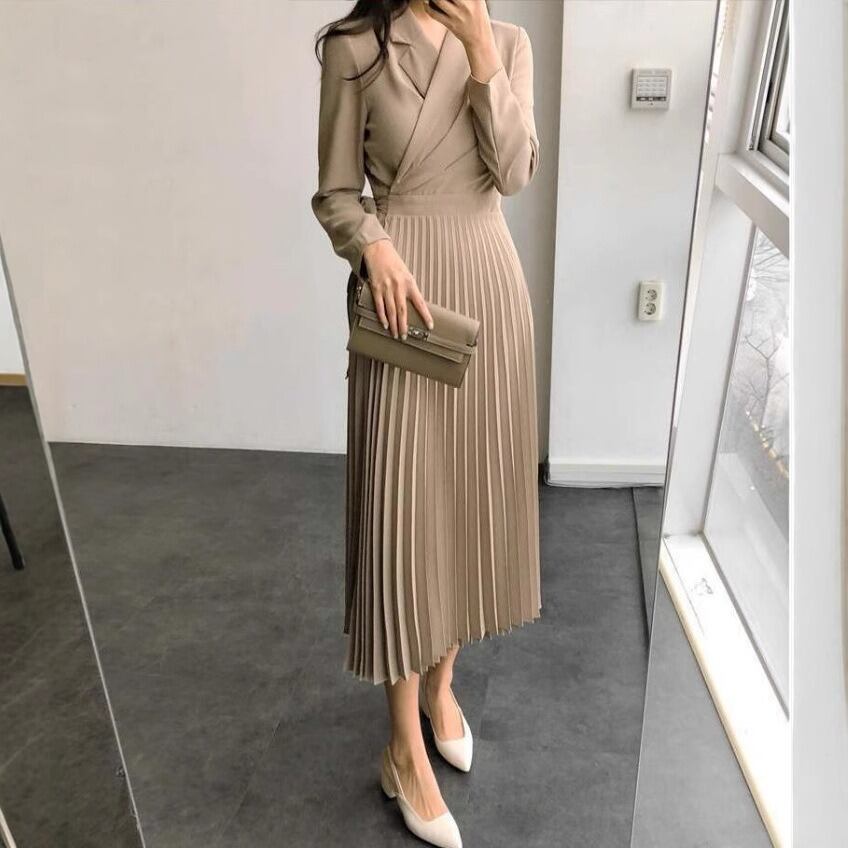 レディース ワンピース スーツ ロング 長袖 Vネック 襟付き プリーツ 大人可愛い きれいめ 上品 おしゃれ かっこいい ガーリー クール エレガント フォーマル 都会的 無地 春 秋 通勤 デート お出かけ お泊まり パーティー イベント レストラン 女子会 休日 ホテル コンサート ライブ カフェ 韓国 コーデ 楽ちん プレゼント 普段使い 着回し 清楚 インスタ映え S M L XL 大きいサイズ ブラック カーキ レッド
