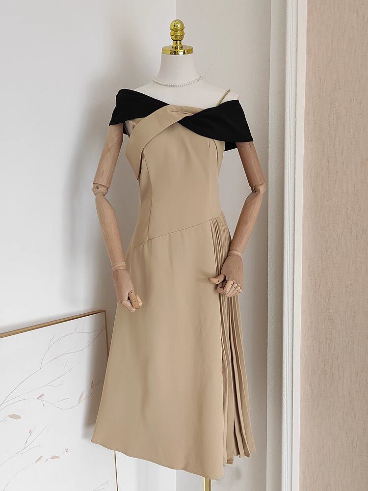 軽やかなプリーツとアシンメトリーなデザインが目を惹く、上品なオフショルダーワンピースです。Aラインのシルエットが美しく広がり、脚長効果を演出しながらフェミニンな雰囲気を引き立てます。