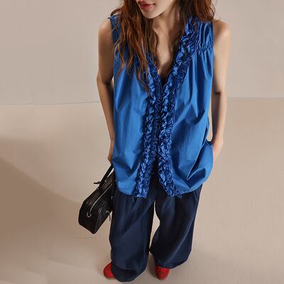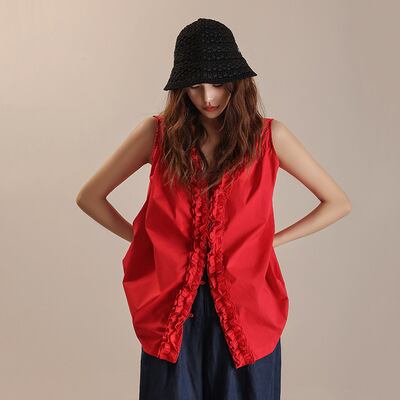 トップス シャツ ノースリーブ 深Vネック 前後2way フリル ミディアム丈 かわいい 可愛い 大人可愛い きれいめ シンプル 上品 おしゃれ かっこいい カジュアル こなれ感 個性的 主役級 存在感 抜け感 春 夏 ベーシック ナチュラル フェミニン ガーリー 無地 女性用 レディース ママ OL 通勤 オフィス 学生 通学 デート お出かけ お泊まり 女子会 旅行 休日 カフェ ショッピング コンパ イベント普段使い デイリー 着回し 重ね着 M L トレンド モテ カラーバリエーション