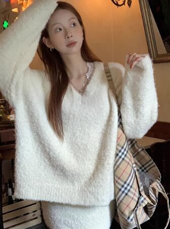 ふわふわの素材感とシンプルなデザインが魅力のレディースニットトップスとスカートのツーピース!