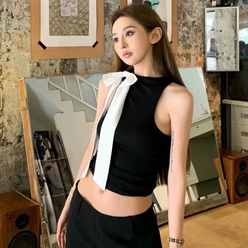 レディース トップス ショート 袖なし ノースリーブ タンクトップ ラウンドネック 襟なし タイト スリム アシンメトリー リボン 配色 バイカラー かわいい 大人可愛い きれいめ シンプル カジュアル おしゃれ ガーリー ラブリー キュート 無地 夏 学生 学校 通学 デート お出かけ イベント リゾート 旅行 海 プール ビーチ 公園 女子会 休日 バカンス ショッピング ライブ カフェ 合コン モノトーン コーデ 普段使い 着回し S M L 白 ホワイト 黑 ブラック