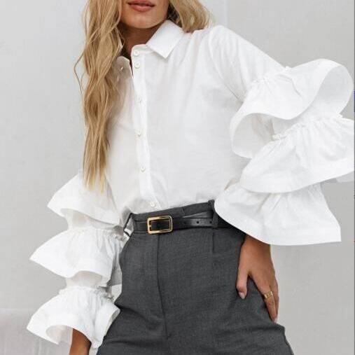 ボリューム袖が女性らしさを引き立て、襟付きデザインが上品さを演出します。